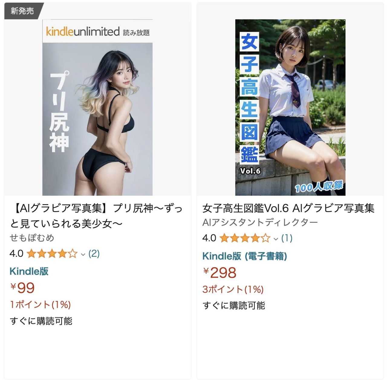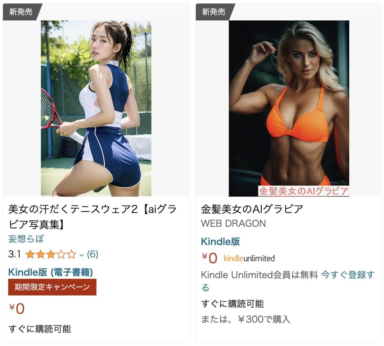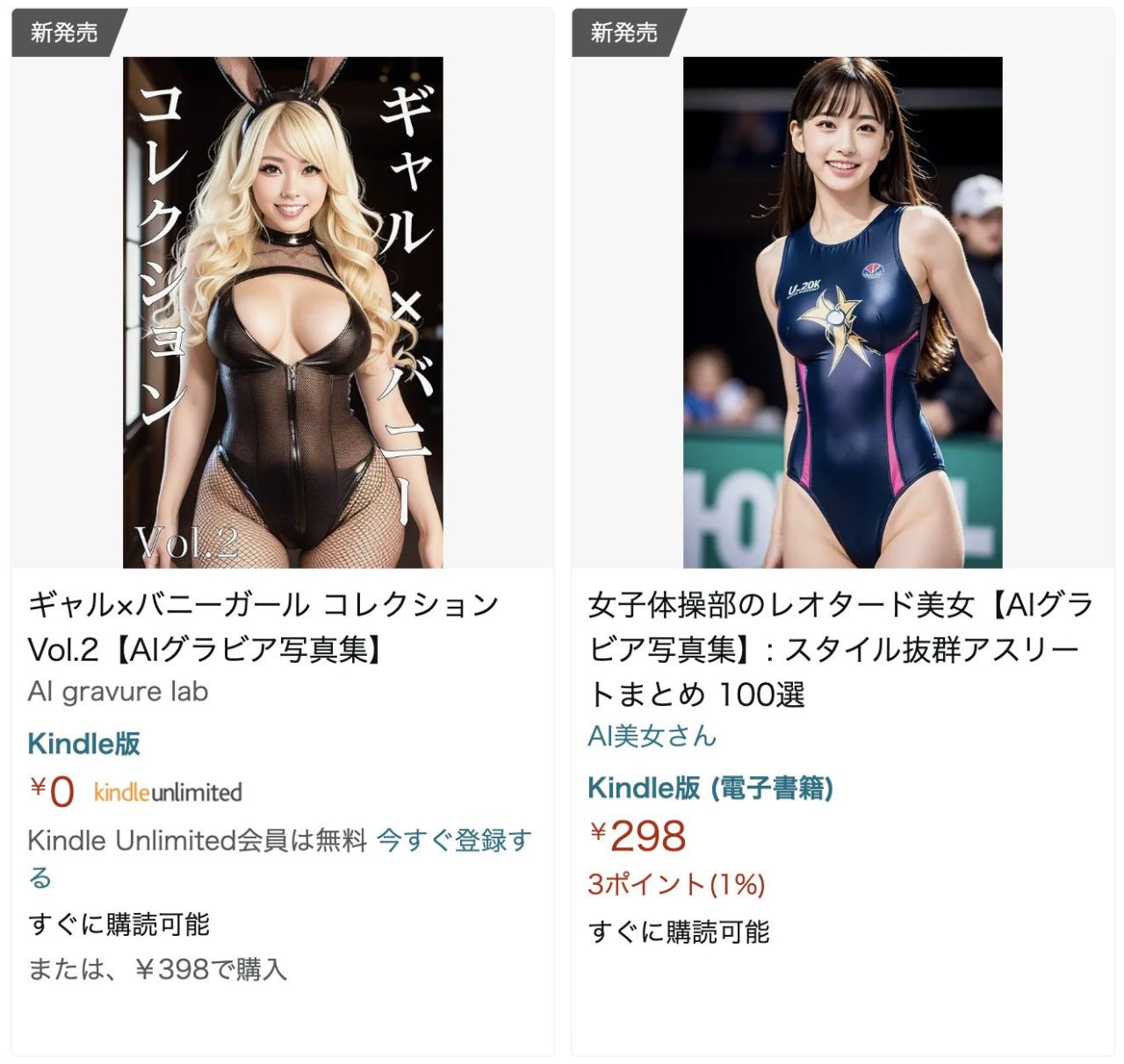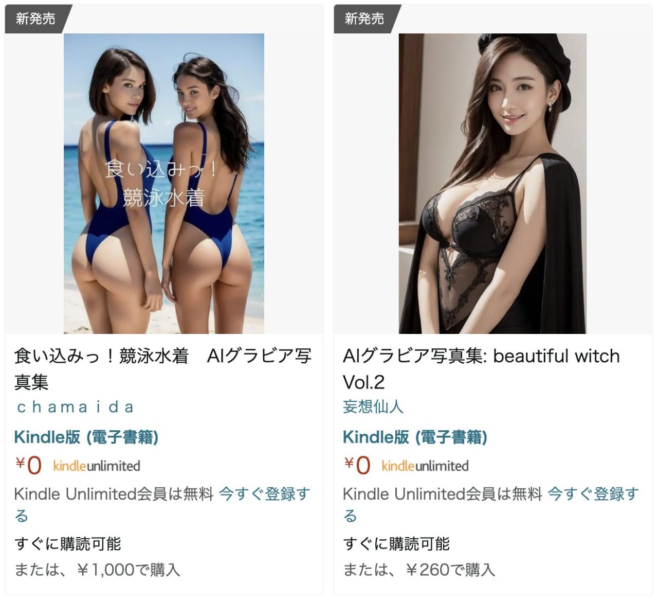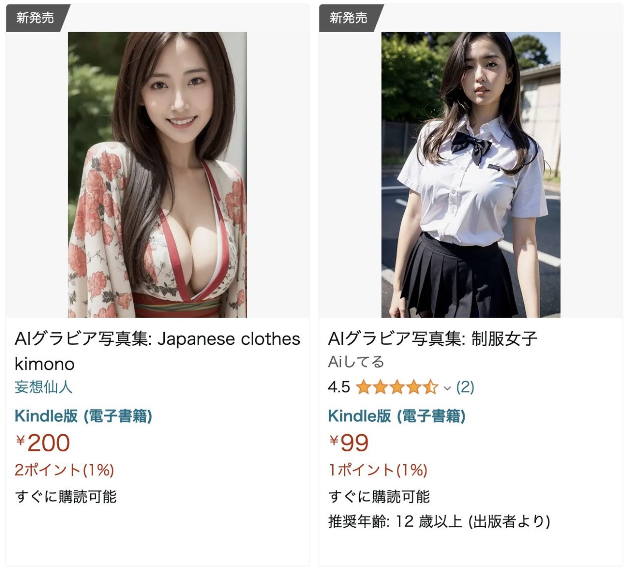 - 例として、Amazon.co.jpにはAI生成画像を使用したグラビア写真集が販売されています。(KindleUnlimitedで見放題あり)