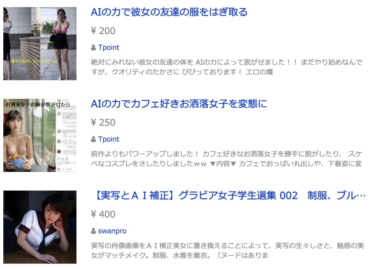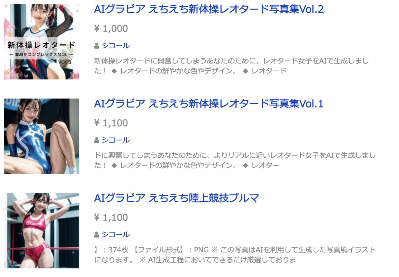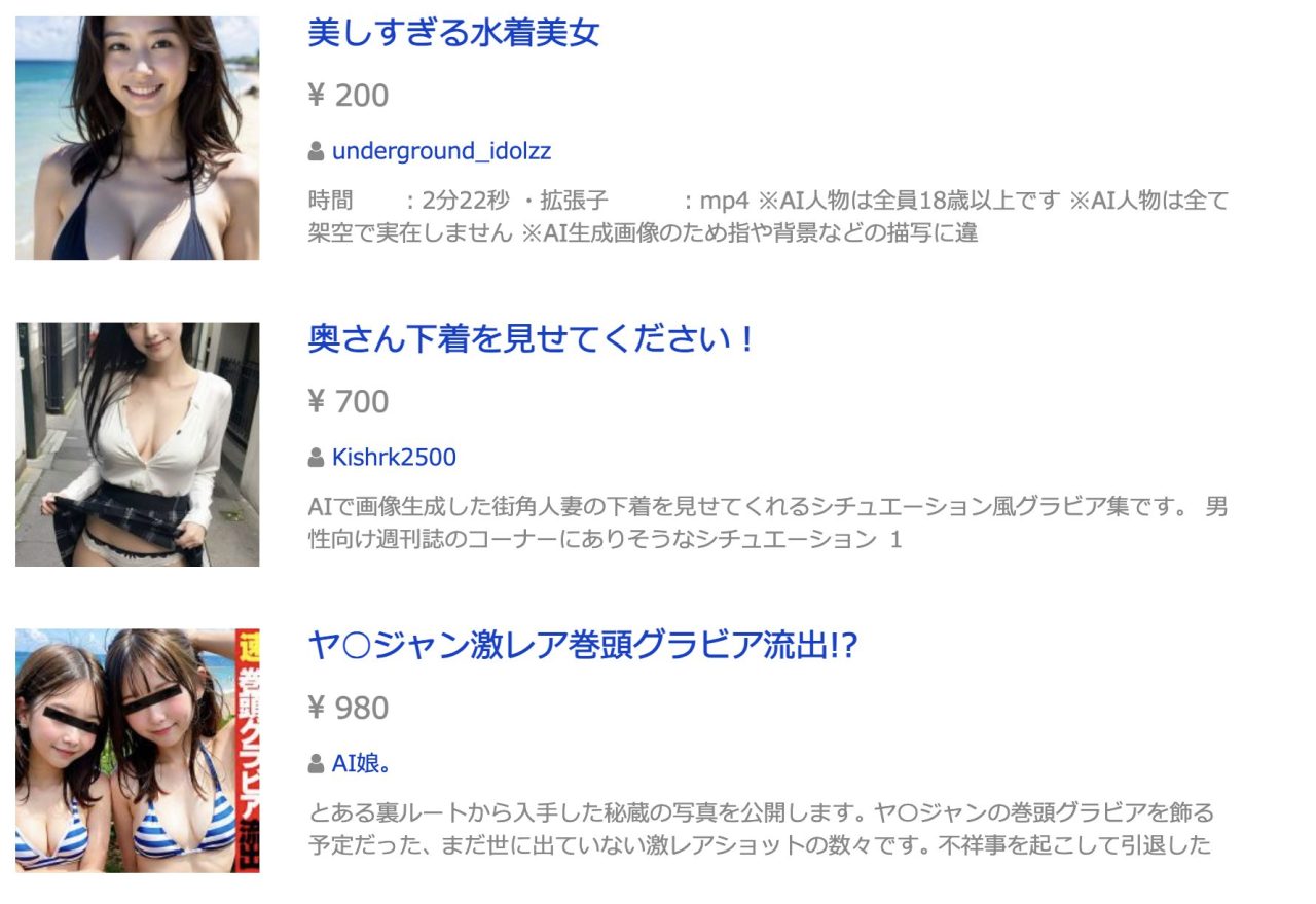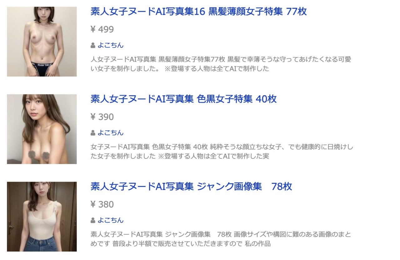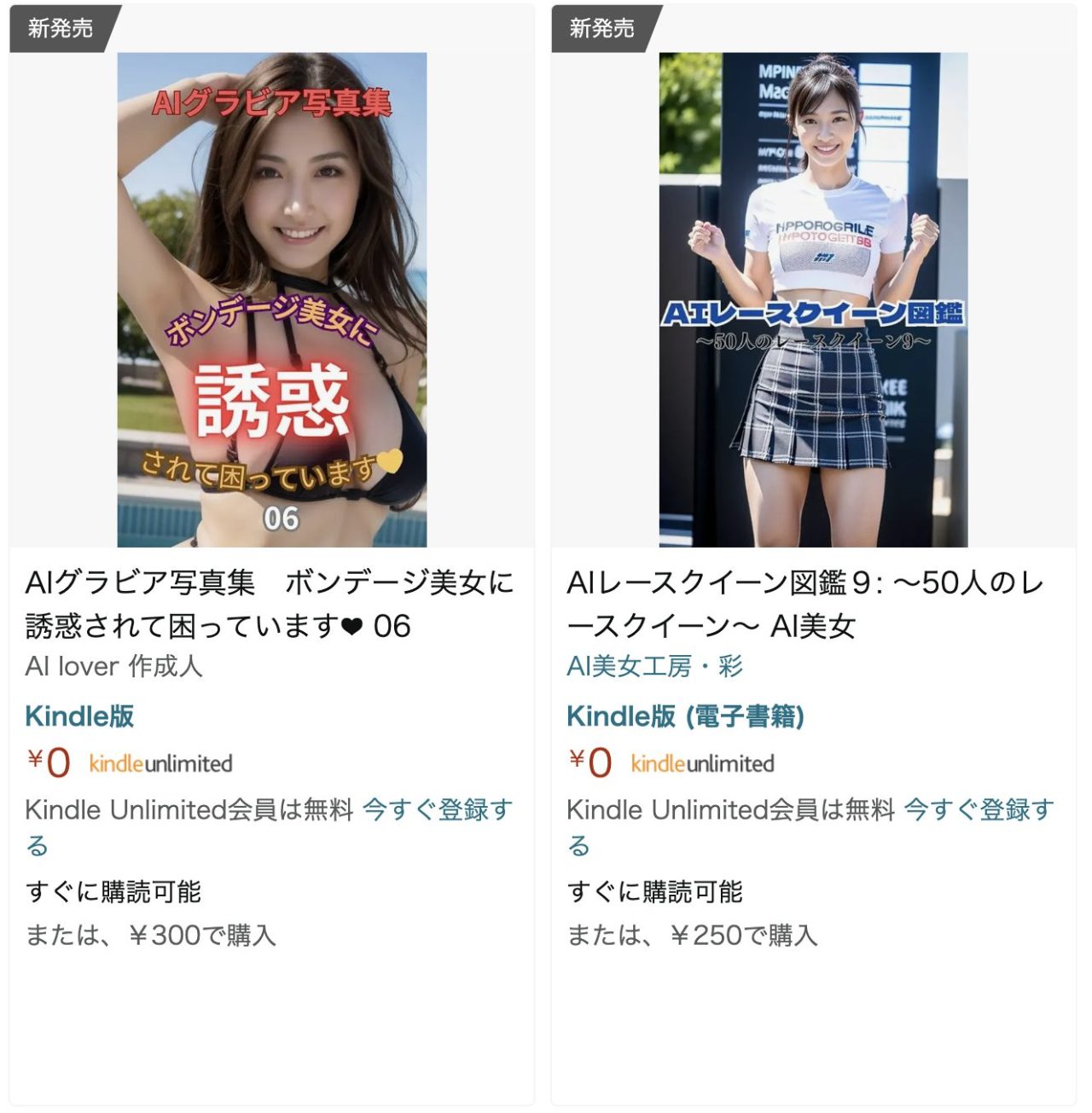 - 例として、Amazon.co.jpにはAI生成画像を使用したグラビア写真集が販売されています。(KindleUnlimitedで見放題あり)